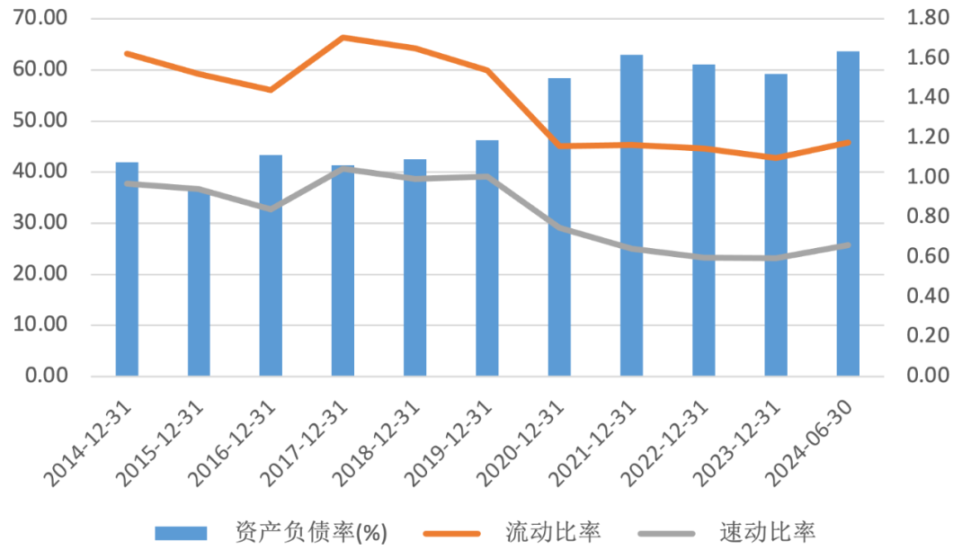 在此资产结构下,公司偿债能力一直较弱,2020年至2024年上半年,楚天科技资产负债率基本处于60%以上的水平,流动比率为1左右,而速动比率最高只有0.29。