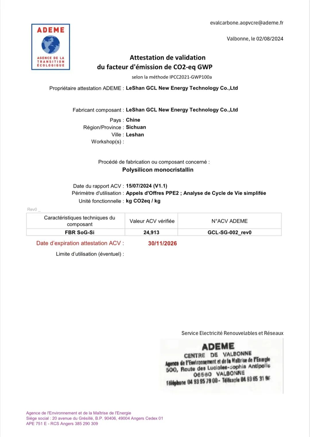 近日,协鑫科技相关负责人表示,公司旗下乐山基地颗粒硅已取得法国环境与能源控制署(ADEME)碳足迹认证,每千克颗粒硅的碳排放仅为24.913千克二氧化碳当量。这一数值较2021年徐州基地颗粒硅37.000千克二氧化碳当量的碳足迹数值,大幅降低了33%,再次刷新全球行业纪录。