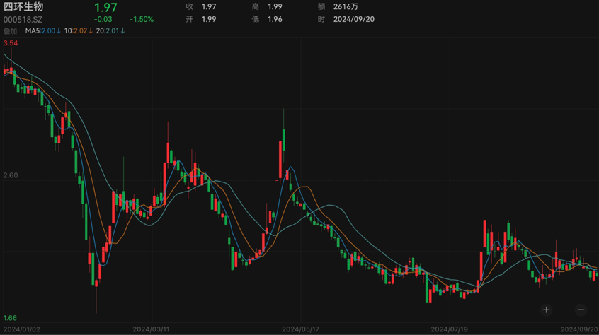二级市场方面,自2021年开始,四环生物股价持续在5元/股以下低位徘徊。今年以来该公司股价进一步跌至2元/股上下波动。截至9月20日收盘,四环生物股价报1.97元/股,总市值为20亿元。