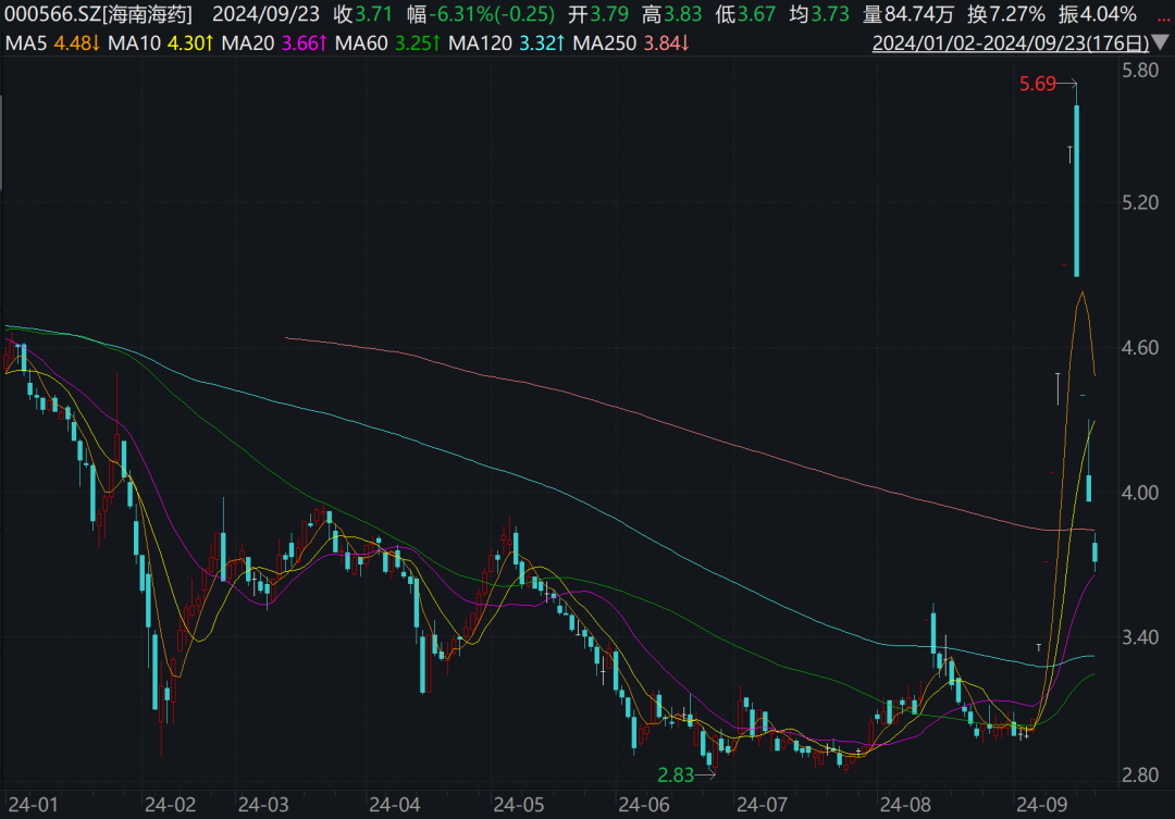在收获6连板后,海南海药股份有限公司(下称海南海药,000566.SZ)股价高台跳水,截至9月20日已连续3个跌停。