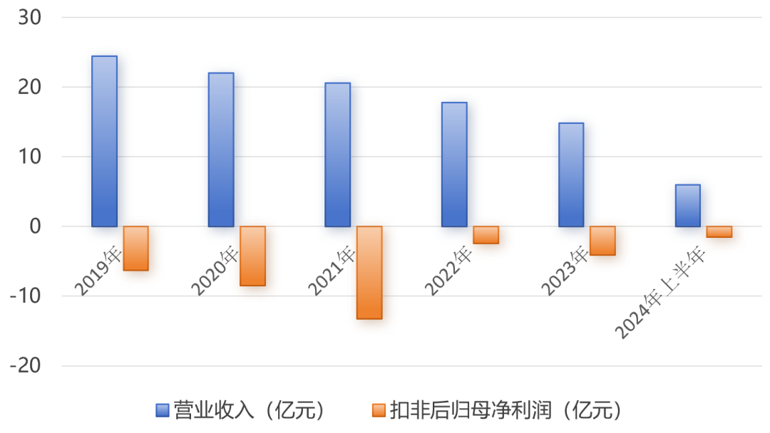 进入2024年,公司业绩仍无起色。上半年,公司实现营收5.93亿元,同比下滑38.16%;实现归母净利润-2.0亿元,上年同期还盈利逾900万元;扣非后归母净利润则为-1.53亿元,亏损同比拉大。也就是说,五年半公司扣非净亏逾36亿元。