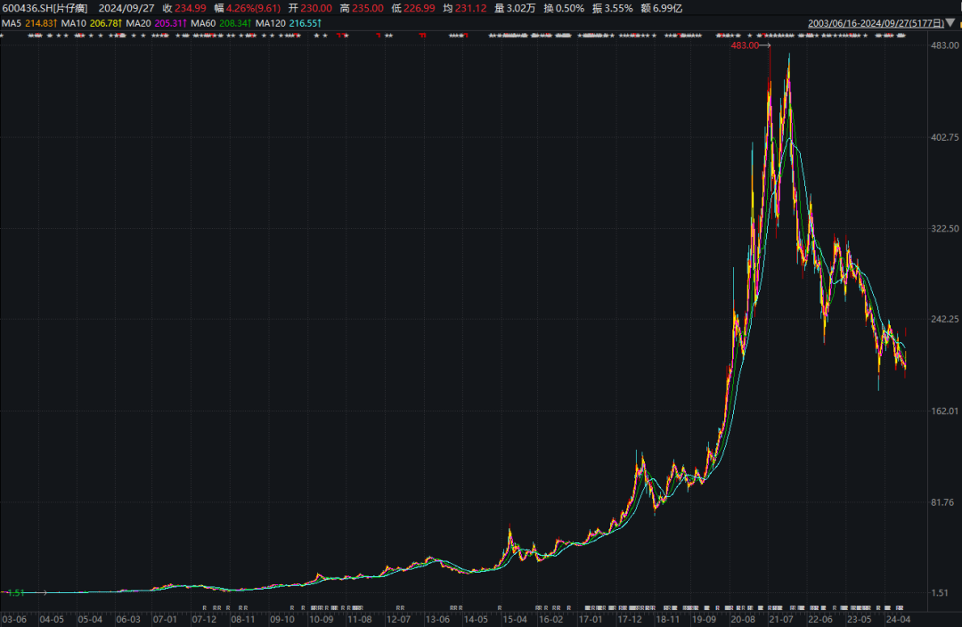 作为以茅台为类比对象的“药茅”,片仔癀自然也难以独善其身。截至9月27日收盘,片仔癀报收于234.99元/股,较2021年7月21日盘中触达的483.00元/股的历史最高点下挫51.35%,当前总市值为1417.74亿元,同样较近3000亿元的历史最高市值腰斩。