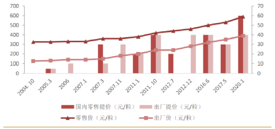 据西南证券研报显示,2004年—2020年,片仔癀产品一共提价19次。其中,片仔癀产品国内零售价共提价9次,从325元提升至590元,累计提价81%;出口零售价共提价10次,从14.5美元/锭提升至51.8美元/锭,累计提价257%。