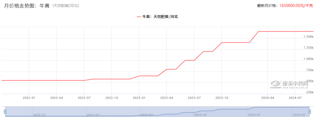 据康美中药网数据显示,天然牛黄的价格从2023年开始快速上涨,仅2023年6月一个月内就从58万元/千克涨至120万元/千克。截至今年9月,天然牛黄已涨至165万元/千克。