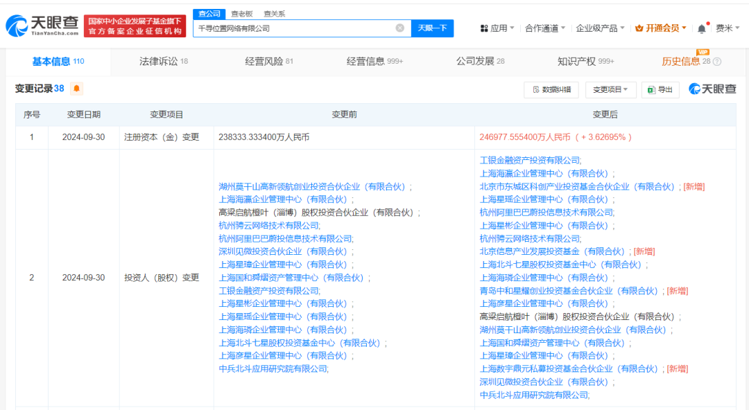 近日,千寻位置网络有限公司发生工商变更,新增北京市东城区科创产业投资基金合伙企业(有限合伙)、北京信息产业发展投资基金(有限合伙)、青岛中和星耀创业投资基金合伙企业(有限合伙)、上海数宇鼎元私募投资基金合伙企业(有限合伙)为股东。天眼查App显示,该公司注册资本同时由约23.8亿人民币增至约24.7亿人民币。