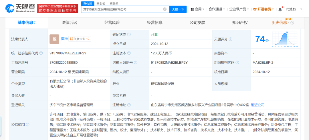 天眼查App显示,近日,济宁市兖州区润开新能源有限公司成立,法定代表人为戴维,注册资本1200万人民币,经营范围含发电业务、输电业务、供(配)电业务,工程和技术研究和试验发展,新兴能源技术研发,新能源汽车换电设施销售,在线能源计量技术研发等。