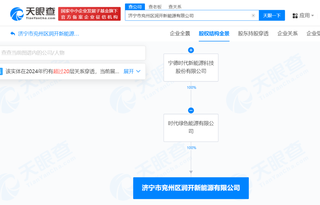 股权全景穿透图显示,该公司由时代绿色能源有限公司全资持股,后者为宁德时代(300750)全资子公司。