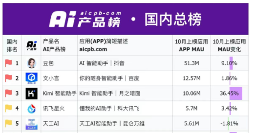 而且,今年10月,抖音旗下的豆包月活用户为5130万,百度的文小言月活为1257万,月之暗面的Kimi智能助手也已追至1006万。而跻身月活千万俱乐部的这三款应用,文小言的月活用户增速最慢,不到2%。