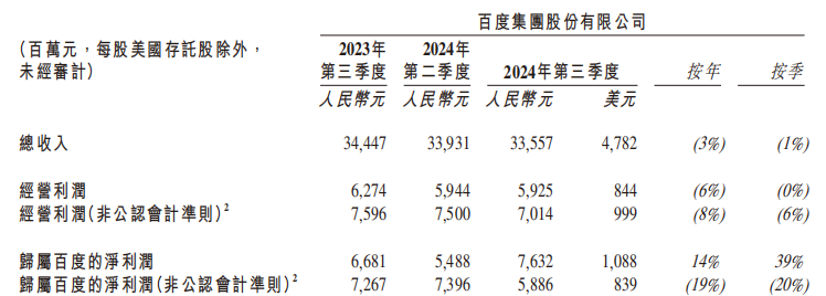 财报显示,百度2024年第三季度实现总营收335.57亿元,同比下滑3%;归属百度的净利润为76.32亿元,同比增长14%,但归属百度的净利润(非公认会计准则、即Non-GAAP)为58.86亿元,同比下降19%。