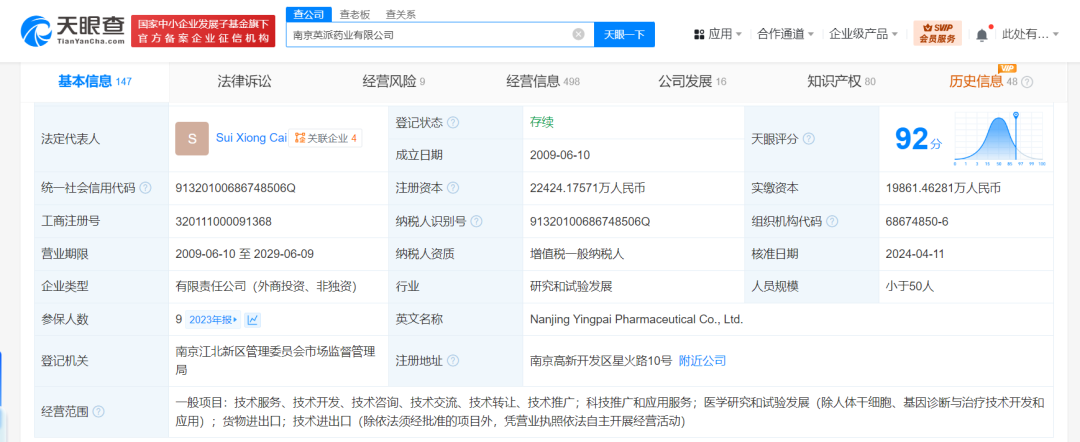 南京英派药业有限公司成立于2009年6月,法定代表人为Sui Xiong Cai,经营范围含科技推广和应用服务、医学研究和试验发展、货物进出口、技术进出口等,现由苏州工业园区新建元生物创业投资企业(有限合伙)、上海礼瀚生物科技合伙企业(有限合伙)、君实生物(688180)及上述新增股东等共同持股。