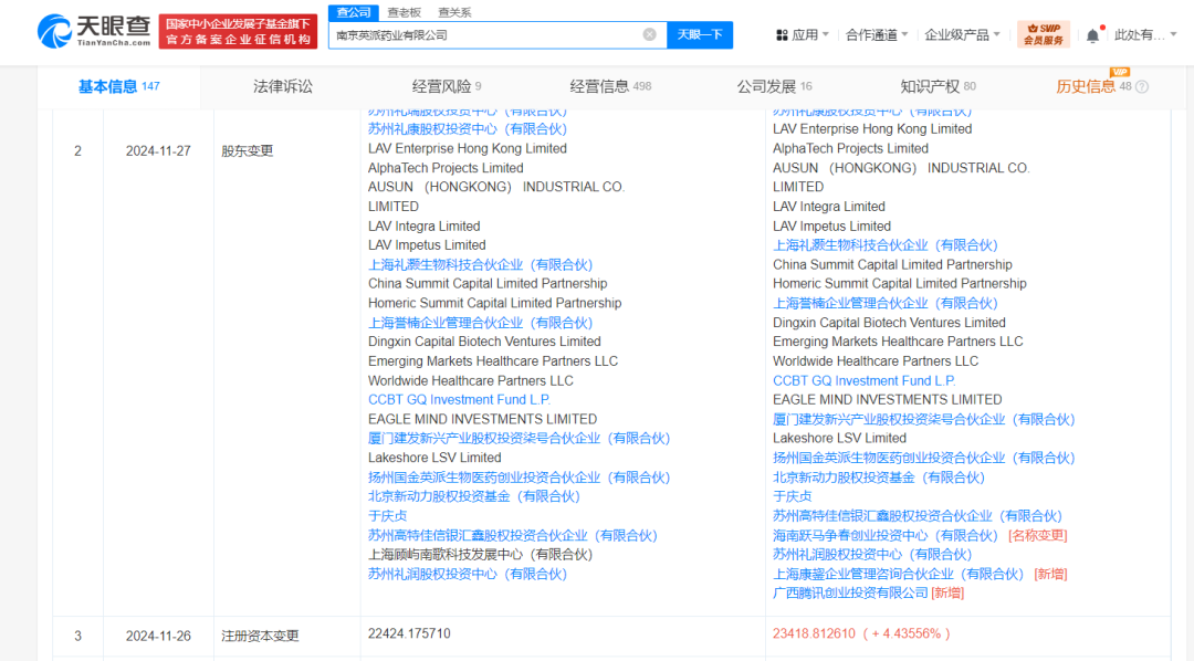 天眼查App显示,近日,南京英派药业有限公司发生工商变更,新增广西腾讯创业投资有限公司、上海康鋆企业管理咨询合伙企业(有限合伙)为股东,同时,注册资本由约2.24亿人民币增至约2.34亿人民币。