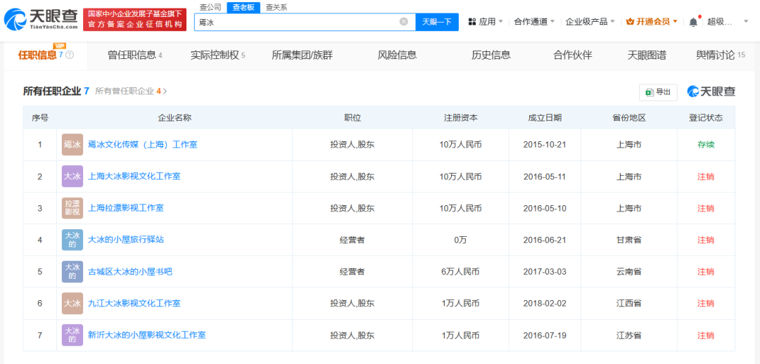 天眼查商业履历信息显示,焉冰(大冰)共关联7家企业,仅焉冰文化传媒(上海)工作室1家为存续状态,其余上海大冰影视文化工作室、新沂大冰的小屋影视文化工作室等均已注销。
