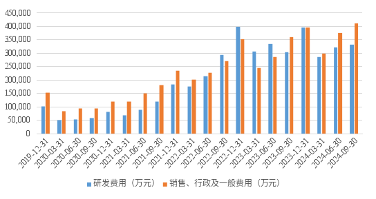 三季度,该公司三费支出高达74.3亿元,较二季度环比增加约4.5亿元。其中,研发费用为33.2亿,同比增长9.2%,较上季度环比增长3.1%;销售、一般及行政费用为41.1亿,较2023年同期增长13.8%,较上季度环比增长9.3%。