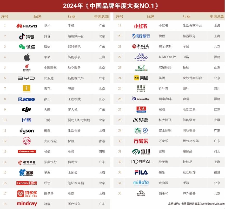 12月18日,由世界品牌实验室(World Brand Lab)主办的2024年“世界经理人峰会”在香港正式召开,被誉为“中国品牌奥斯卡”的“中国品牌年度大奖”榜单揭晓,苹果、比亚迪、飞鹤等35个活跃在2024年度中国经济舞台的领军品牌入选“中国品牌年度大奖NO.1”。