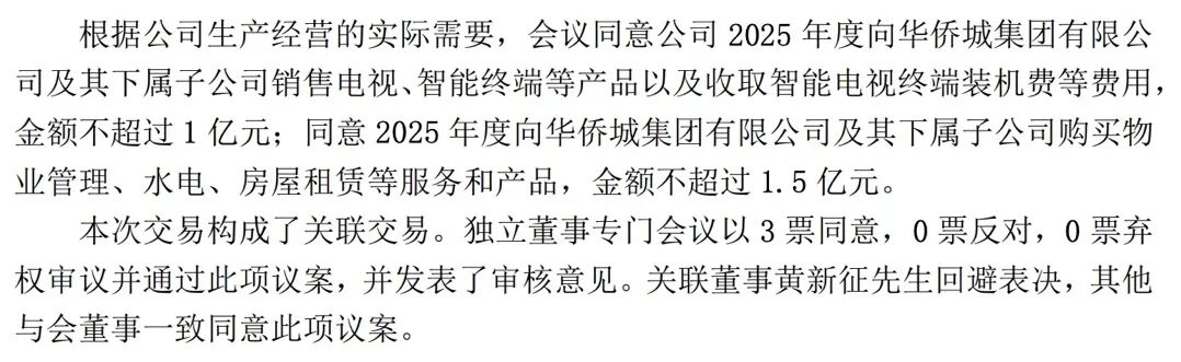 值得关注的是,2025年4月11日,康佳集团召开董事局会议,审议通过了一项交易预案:同意康佳集团在2025年向华侨城集团及其下属子公司销售电视、智能终端等产品,并收取智能电视终端装机费等费用,交易金额上限为1亿元。据悉,华侨城集团为康佳集团的控股股东,就在前几日,该股东释刚放出拟“放手”康佳集团的意向。