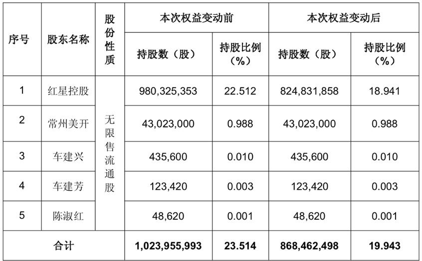 根据重整计划,红星控股持有的公司约1.55亿股股票(占公司总股本的3.57%)将全部直接以抵债形式向普通债权人进行分配。分配完毕后,红星控股持有的公司股份将从约9.8亿股减少至约8.25亿股,持股比例由22.51%降至18.94%,红星控股及其一致行动人合计持股比例将从23.51%下降至19.94%。上述权益变动后,红星控股原实际控制人车建兴(即车建新)将不再控制红星控股。