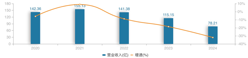 2020年至2024年美凯龙营收、归母净利润及同比变动情况(亿元、%)