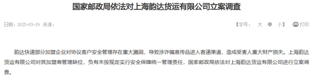 投资时间网、标点财经研究员注意到,早在今年3月19日,国家邮政局就发布公告称,韵达快递部分加盟企业对协议客户安全管理存在重大漏洞,导致涉诈骗宣传品进入寄递渠道,造成受害人重大财产损失。因上海韵达对其加盟商管理缺位,负有未按规定实行安全保障统一管理责任,国家邮政局依法对上海韵达进行立案调查。