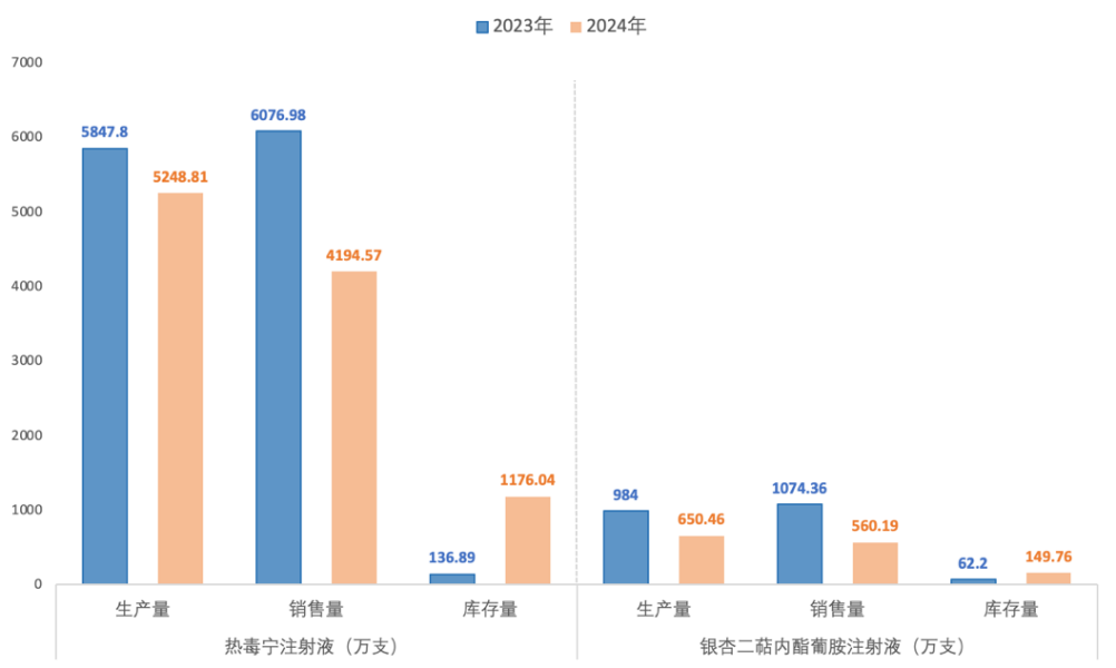 深入分析发现,2024年康缘药业的核心品种热毒宁注射液、银杏二萜内酯葡胺注射液销量遭遇“滑铁卢”,分别较上年下滑30.98%和47.86%。同期,二者生产量同比虽也有所缩减,但降幅均不及销量降幅。生产与销售的不匹配直接导致库存挤压,这一年,这两类产品的库存量分别较上年大幅攀升759.11%和140.77%。