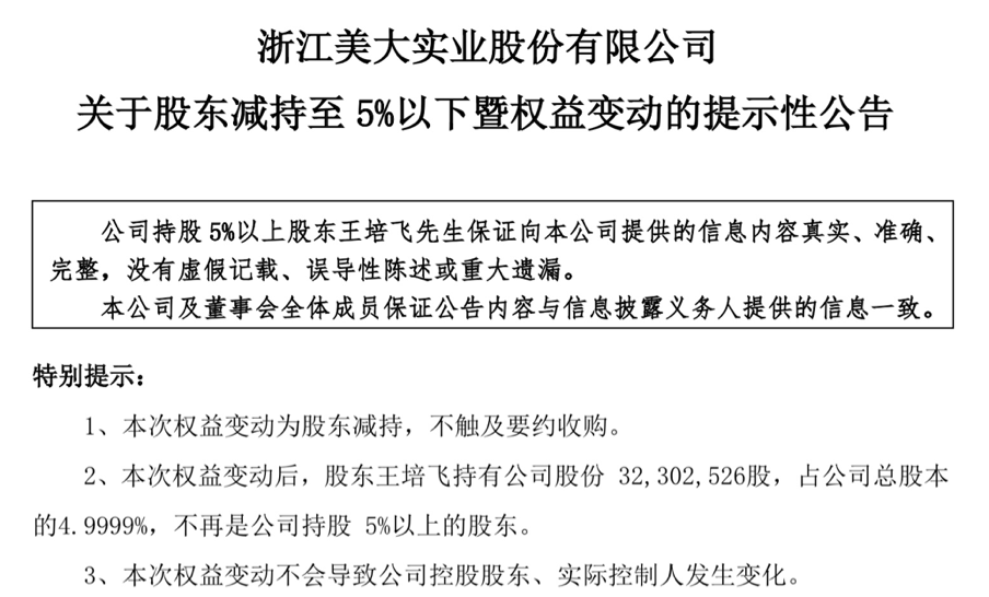 浙江美大发布高管减持相关公告