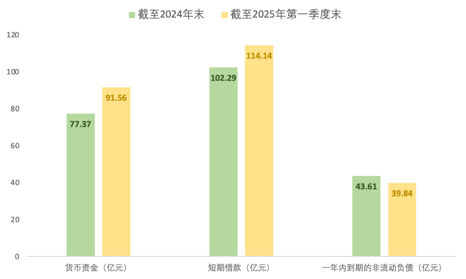 截至2025年第一季度末,雅戈尔短期借款和一年内到期的非流动负债合计达153.98亿元,超过同期91.56亿元货币资金