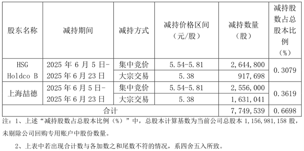 6月24日,东鹏控股对上述股东减持进展进行披露。据悉,今年6月5日至6月23日,HSG Holdco B、上海喆德通过集中竞价、大宗交易方式合计减持公司股份约774.95万股,占公司目前总股本的0.6698%。本次减持后,两股东合计持股比例降至5%(剔除回购账户前),首次低于5%,权益变动跨越1%。而此前,上海喆德已多次减持公司股份。