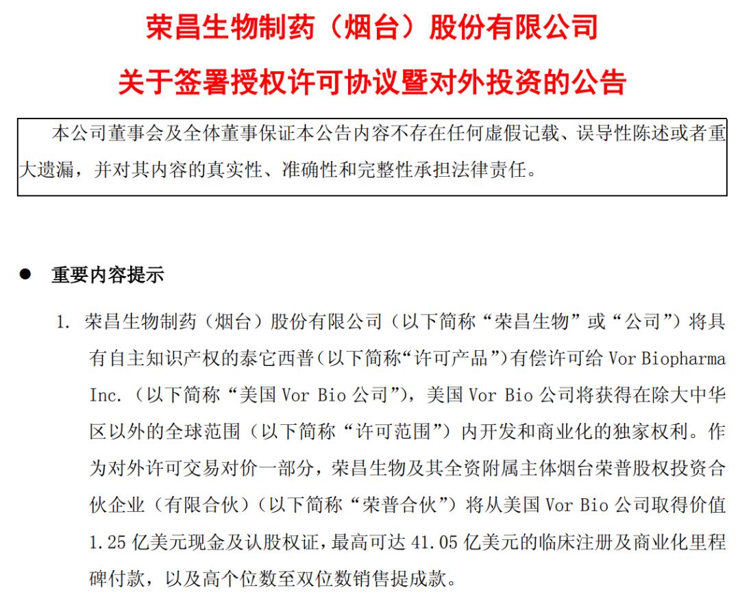 作为对外许可交易对价一部分,荣昌生物及其全资附属主体荣普合伙,将从美国Vor Bio(VOR.O)公司取得4500万美元首付款及8000万美元认股权证。同时,基于临床开发进度及上市的销售情况,Vor Bio公司还将支付最高可达41.05亿美元的临床注册及商业化里程碑付款,以及高个位数至双位数销售提成款。