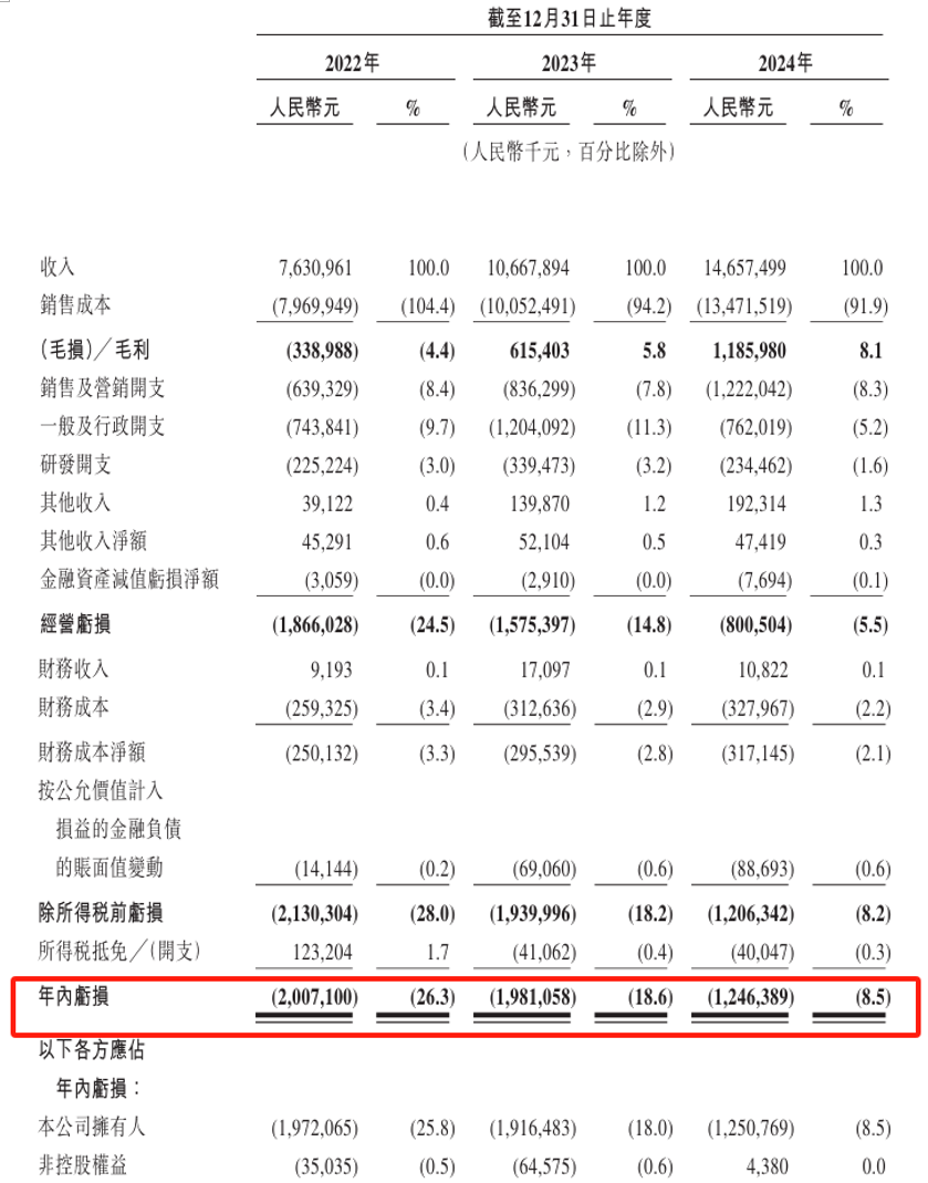 财务数据显示,曹操出行近年来营收增长较快,2022年至2024年营收分别为76.31亿元、106.68亿元和146.57亿元,年复合增长率达38.5%。与此同时,公司持续亏损,同期年内亏损分别为20.07亿元、19.81亿元和12.46亿元,三年累计亏损52.34亿元。