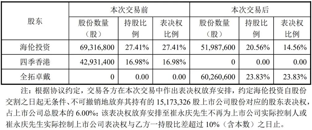 根据协议内容,陈海伦、金海芬及陈朝峰拟将合计间接持有的6026.06万股海伦钢琴股份转让给全拓卓戴,这些股份占股权转让协议签署日海伦钢琴股份总数的23.83%。此外,海伦投资无条件、不可撤销地放弃其持有的约1517.33万股海伦钢琴股份(占本协议签署日海伦钢琴股份总数的6%)对应的股东表决权,期限至崔永庆不再为海伦钢琴实际控制人,或崔永庆实际控制海伦钢琴表决权与乙方(海伦投资、四季香港) 持股比例差超过10%(含本数)之日止。