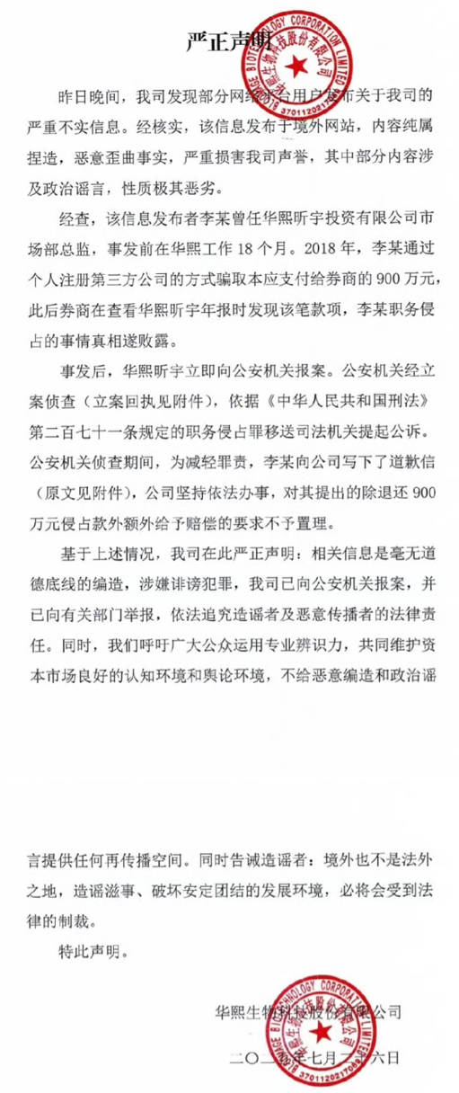 针对此事,7月26日中午,华熙生物在官方微博发布《关于网络不实信息的严正声明》,称相关内容“纯属捏造,恶意歪曲事实,涉嫌诽谤犯罪”,并表示公司已向公安机关报案,依法追究造谣者及恶意传播者的法律责任。
