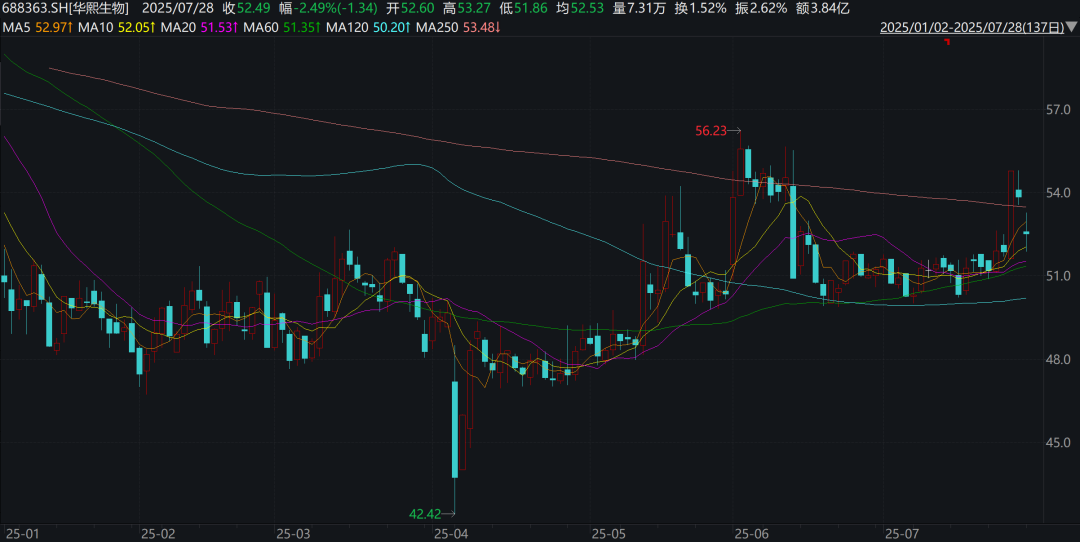 从二级市场反应来看,7月25日,华熙生物股价报53.83元/股(不复权,下同),下跌1.73%。7月28日,华熙生物股价低开逾3%,截至收盘,该股下跌2.49%,报52.49元/股,市值为253亿元。