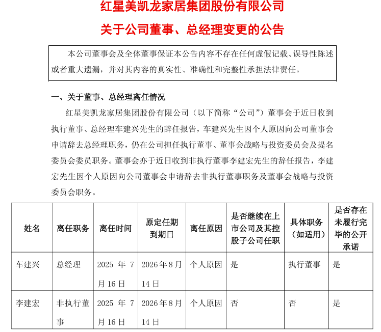 而在此之前的5月,红星美凯龙家居集团股份有限公司(下称美凯龙,601828.SH;红星美凯龙,1528.HK)创始人车建兴被云南省监察委员会立案调查并实施留置。7月19日,美凯龙发布公告称,公司董事会于近日收到执行董事、总经理车建兴的辞任报告,车建兴因个人原因向公司董事会申请辞去总经理职务,但仍在公司担任执行董事、董事会战略与投资委员会及提名委员会委员职务。