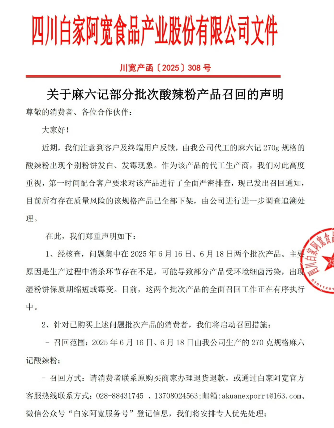 7月27日,麻六记酸辣粉代工商四川白家阿宽食品产业股份有限公司(下称阿宽食品,874639.NQ)发布的公告间接证实了消费者提出的问题。公告显示,公司收到客户和终端用户反馈,由其代工的麻六记规格为270克的酸辣粉出现个别粉饼发白、发霉现象。公司第一时间配合客户要求对该产品进行全面严密排查,并发出召回通知,目前所有存在质量风险的该规格产品已全部下架,由公司进行进一步调查追溯处理。