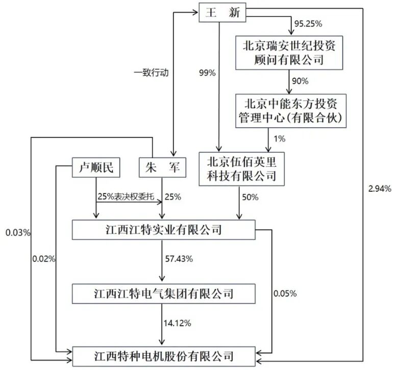 同日,伍佰英里科技控股股东王新与朱军签署《一致行动协议》,约定自股权转让完成工商变更之日起,双方在江特实业、江特电气及江特电机的经营管理和决策中一致行动。同时,卢顺民与朱军签署《表决权委托协议》,约定自本次转让完成工商变更之日起,卢顺民将其持有的江特实业25%股权对应的表决权等股东权利,全部委托给朱军行使。