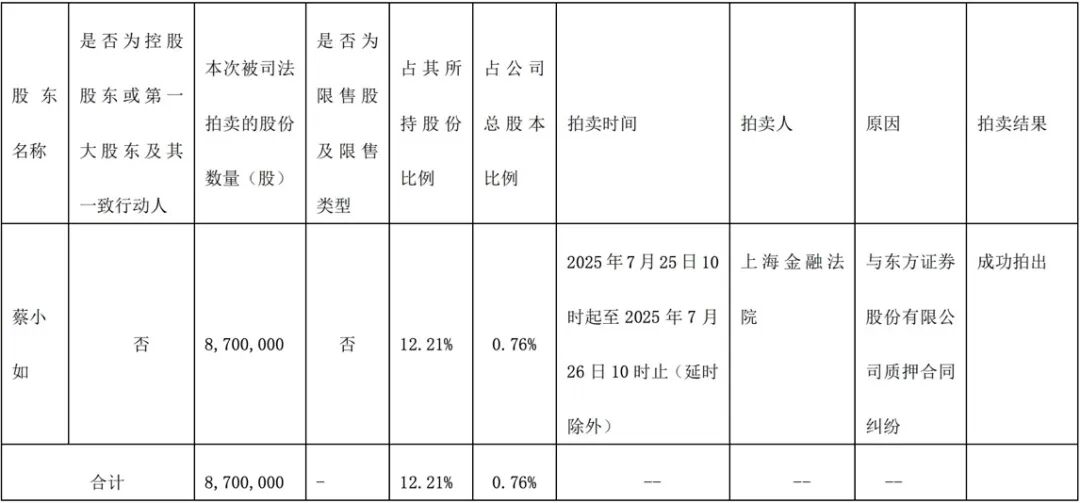 其二,达华智能披露了持股5%以上股东蔡小如所持部分股份被司法拍卖的最新进展:上海金融法院在淘宝网司法拍卖网络平台,公开拍卖蔡小如持有的达华智能870万股股份,最终以3883.68万元成交,拍卖事由系蔡小如与东方证券股份有限公司的质押合同纠纷。