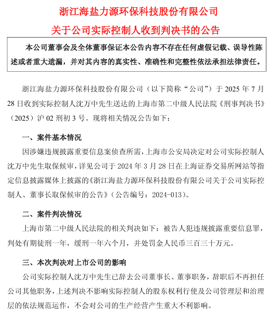 7月29日晚间,力源科技发布公告称,公司实际控制人沈万中因涉嫌违规披露重要信息罪,已被上海市第二中级人民法院作出一审判决:判处有期徒刑一年,缓刑一年六个月,并处罚金330万元。