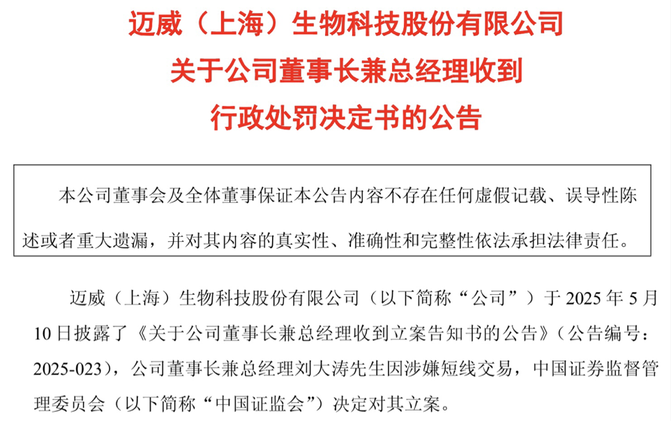 今年5月,迈威(上海)生物科技股份有限公司(下称迈威生物,股票简称:迈威生物-U,688062.SH)董事长兼总经理刘大涛,因涉嫌短线交易被中国证监会立案调查。3个月后,证监会对刘大涛的立案调查有了处理结果。