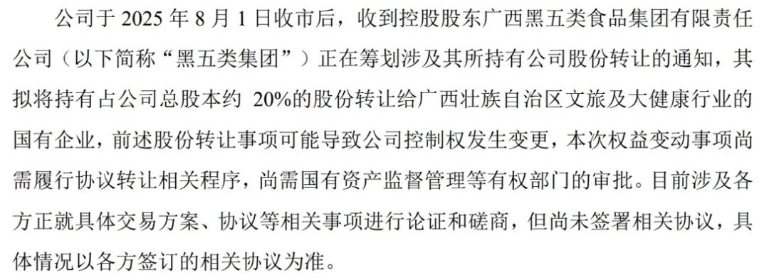 投资时间网、标点财经研究员注意到,黑芝麻公告称,收到控股股东黑五类集团正在筹划涉及其所持有公司股份转让的通知,黑五类集团拟将持有的占该公司总股本约20%股份,转让给广西壮族自治区文旅及大健康行业的国有企业,该事项可能导致黑芝麻控制权发生变更。