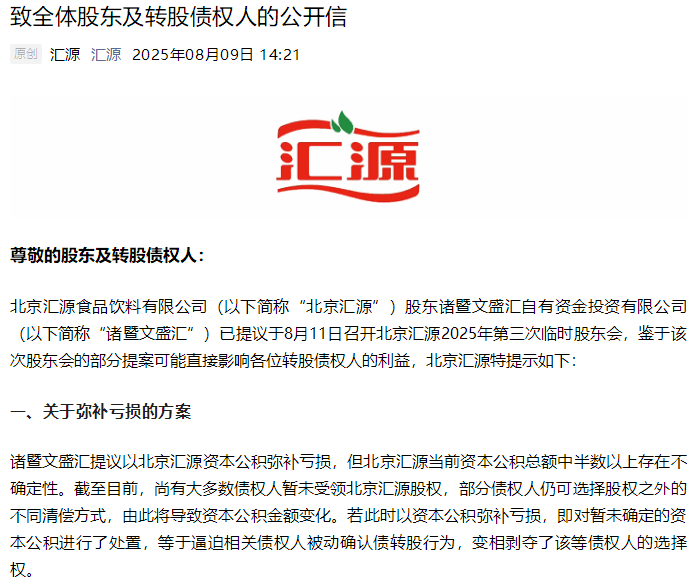 而北京汇源之所以将这些矛盾公之于众,导火索是诸暨文盛汇提议在8月11日召开临时股东会,其中一项议案为“以资本公积弥补亏损”。北京汇源指出,公司当前资本公积中半数以上金额存在不确定性——多数债权人尚未完成债转股登记,部分债权人仍有权选择现金清偿等其他方式。若此时通过该议案,相当于变相剥夺债权人的选择权,迫使其被动接受股权清偿。