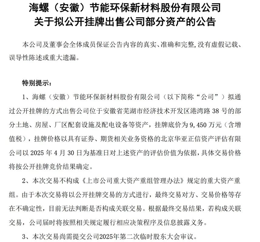 海螺(安徽)节能环保新材料股份有限公司(下称海螺新材,000619.SZ)近日发布一则出售资产的公告。公告显示,该公司拟通过公开挂牌方式,出售位于安徽省芜湖市经济技术开发区港湾路38号的部分土地、房屋、厂区配套设施及配电设备等资产,挂牌底价为9450万元(含增值税),具体交易价格将按公开挂牌竞价结果确定。