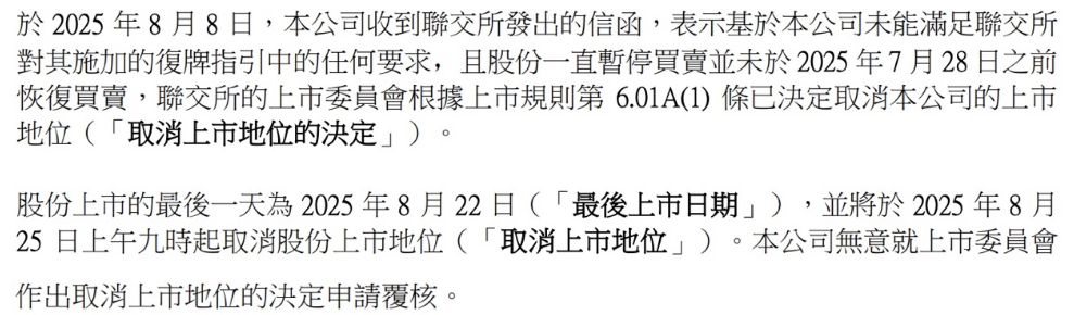 这意味着,2025年8月25日,中国恒大将从港交所退市。