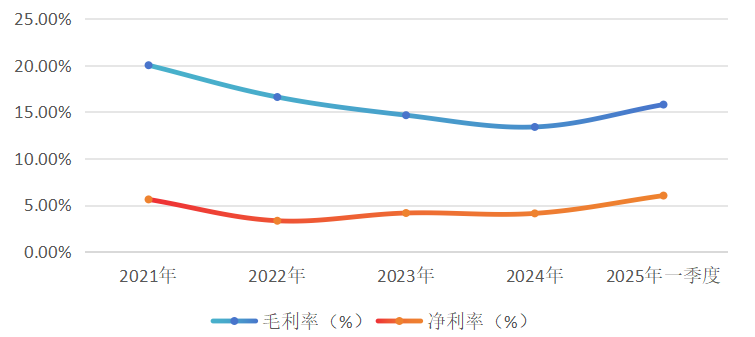 值得注意的是,近几年来,曼卡龙毛利率走低,由2020年的28.21%逐年降至2024年的13.38%。过去一年,公司毛利率走低或主要由于镶嵌饰品业务毛利率下降所致,镶嵌饰品毛利率同比减少5.74个百分点至37.26%。此外,收入占比96%以上的素金饰品,毛利率为12.37%,也仅同比微增不到0.5%。今年一季度,该公司营收、归母净利润分别增至7.14亿元、0.43亿元,但毛利率依旧同比走低。公司盈利修复节奏、全国化门店布局进展情况值得关注。