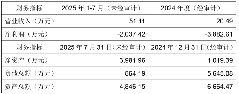 尽管拥有诸多光环,但投资时间网、标点财经研究员注意到,中晟微目前业绩不佳。公告显示,中晟微2024年和今年前7个月仅分别实现营收20.49万元和51.11万元,同期分别实现净利润-3882.61万元和-2037.42万元,近期并未实现盈利。截至今年7月末,中晟微的资产总额为4846.15万元,负债总额为864.19万元,净资产为3981.96万元。
