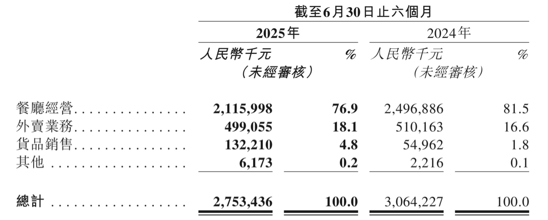 2025年上半年,九毛九来自货品销售的收入从上年同期的0.55亿元上升至1.32亿元,同比增长140%,占总收入的比例从1.8%增至4.8%,也是该公司整体收入中唯一实现高速增长的板块。