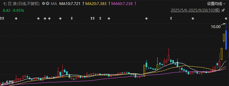 9月26日,七匹狼(002029.SZ)以跌停收盘,收报8.42元/股(不复权,下同),市值不到60亿元。而在此之前,公司连拉两个涨停板,并于9月25日晚间发布交易异常波动公告。