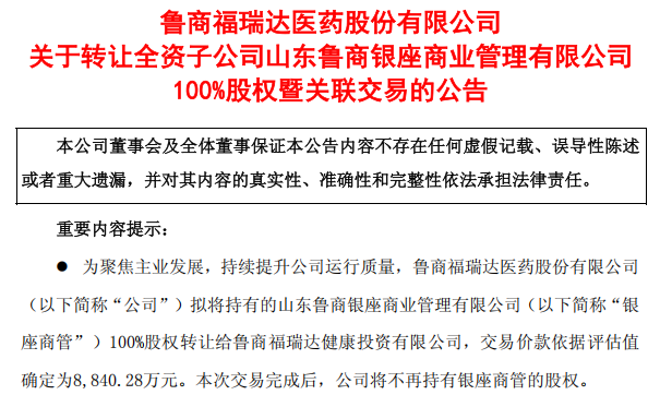鲁商福瑞达医药股份有限公司(下称福瑞达,600223.SH)公告称,拟将持有的全资子公司山东鲁商银座商业管理有限公司(下称银座商管)100%股权,以8840.28万元转让给鲁商福瑞达健康投资有限公司(下称福瑞达健康投资)。本次交易完成后,福瑞达不再持有银座商管股权。