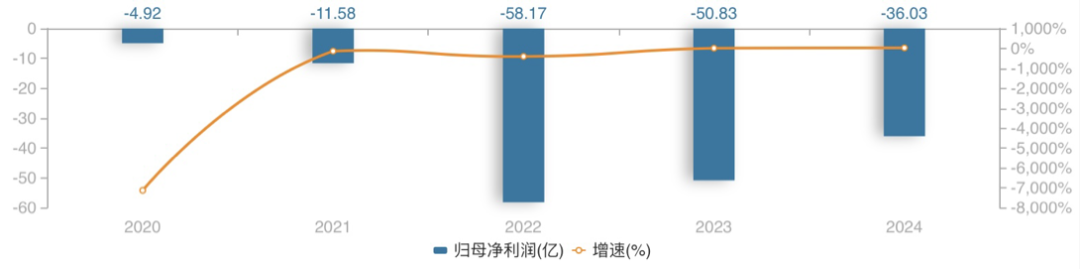 2020年至2024年东方园林归母净利润及同比情况(亿元、%)