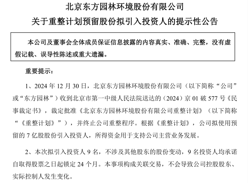 东方园林发布关于重整计划预留股份拟引入投资人的提示性公告