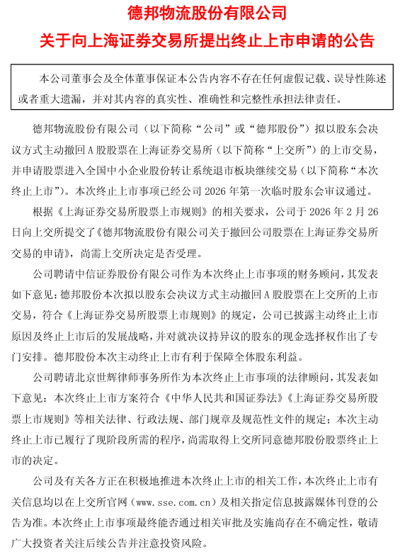 深耕物流行业三十载、曾头顶“中国零担之王”光环的德邦股份(603056.SH),拟以主动退市方式告别A股舞台。