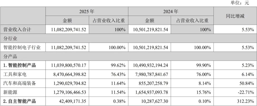 在2025年年报中,智能控制产品仍是拓邦股份的核心支柱,收入同比增长5.23%至110.40亿元,占公司总营收比重99.62%。不过,有分析指出,其中的新能源板块或对整体经营产生一定拖累,年内,该板块收入同比下滑22.71%,公司将此归因于非家储产品收入同比下滑及产品口径调整共同影响。